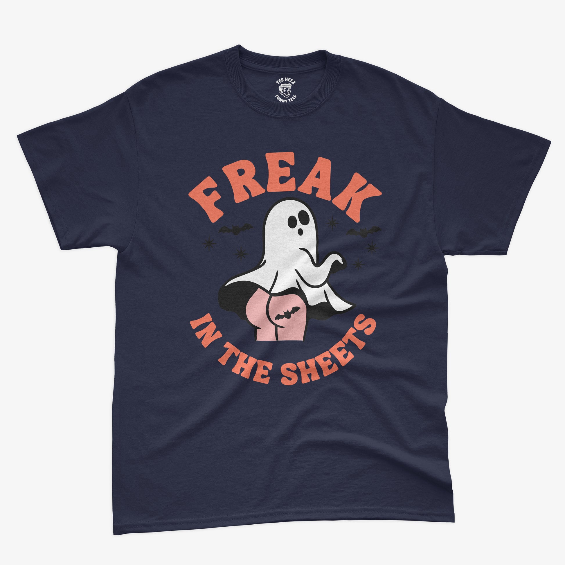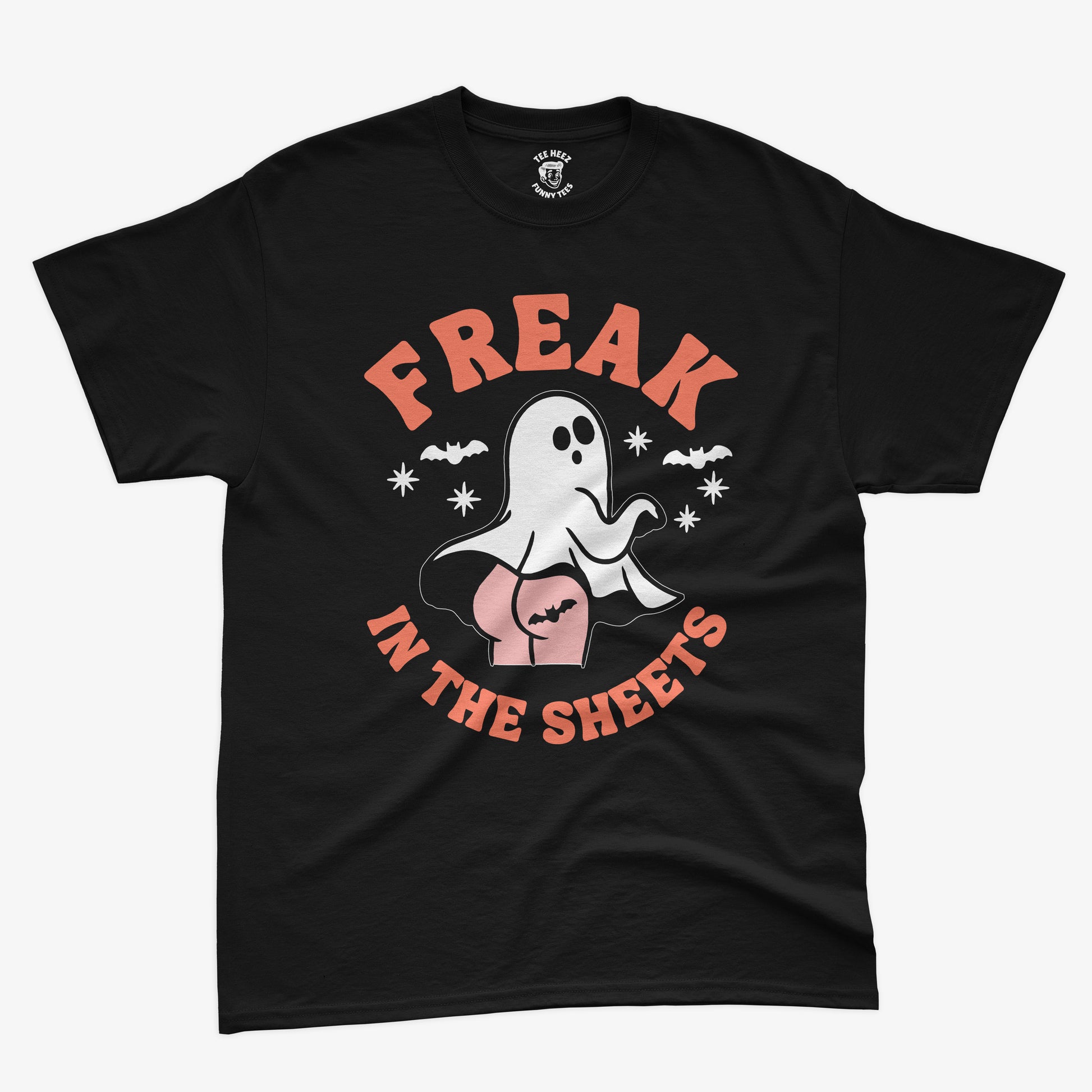 Our “Freak in the Sheets” tee is the perfect mix of spooky and spicy, featuring a cheeky ghost baring more than just its soul. Whether you're haunting the club or just creeping through October, this hilarious Halloween shirt is sure to raise spirits (and eyebrows).