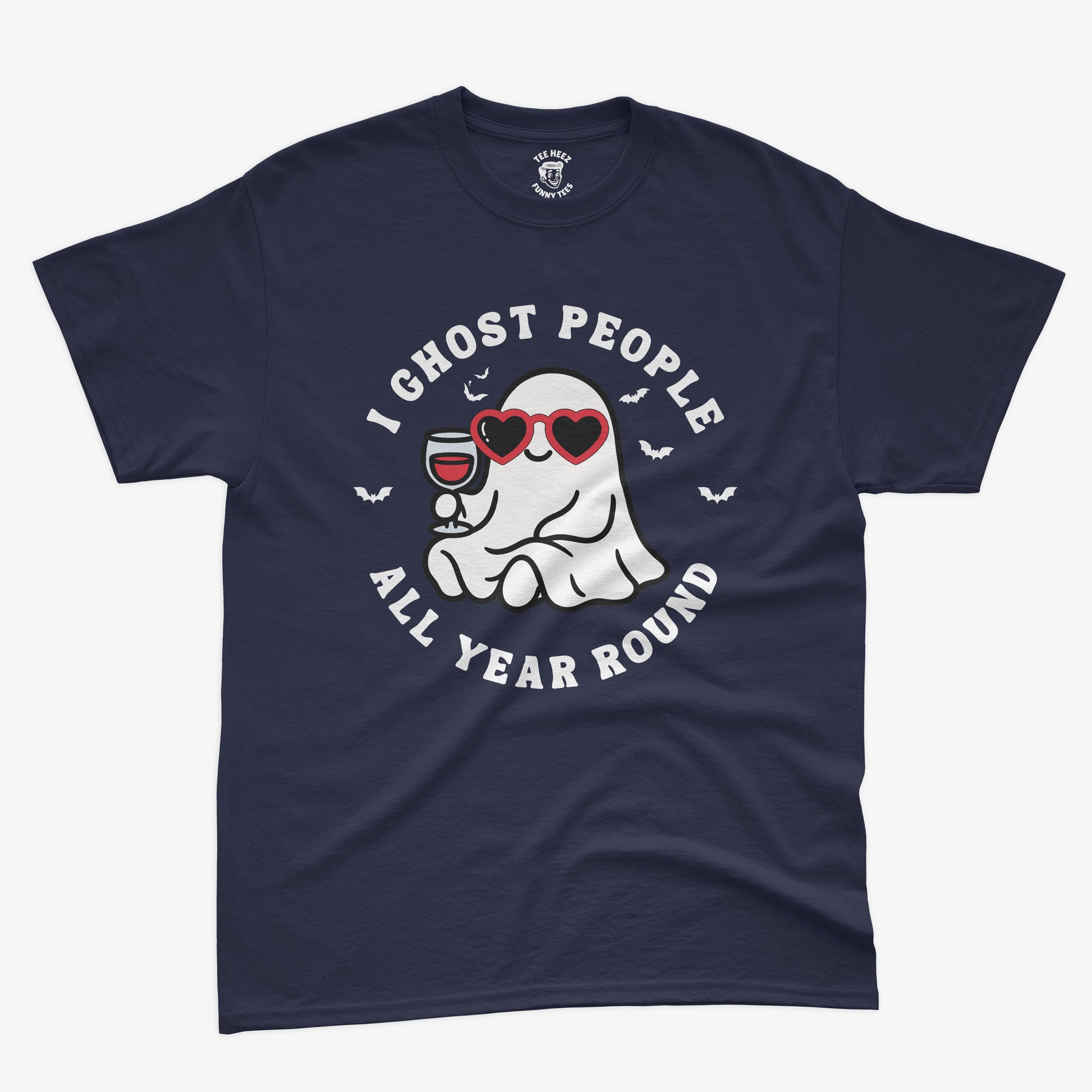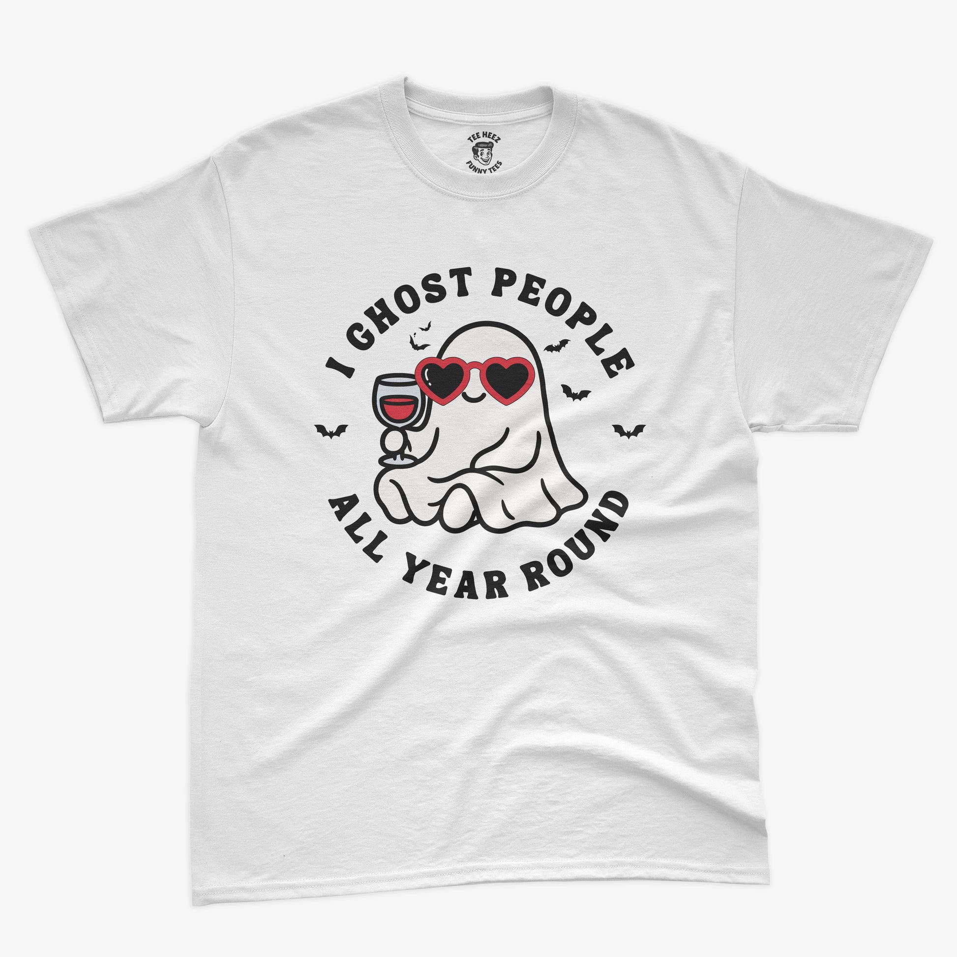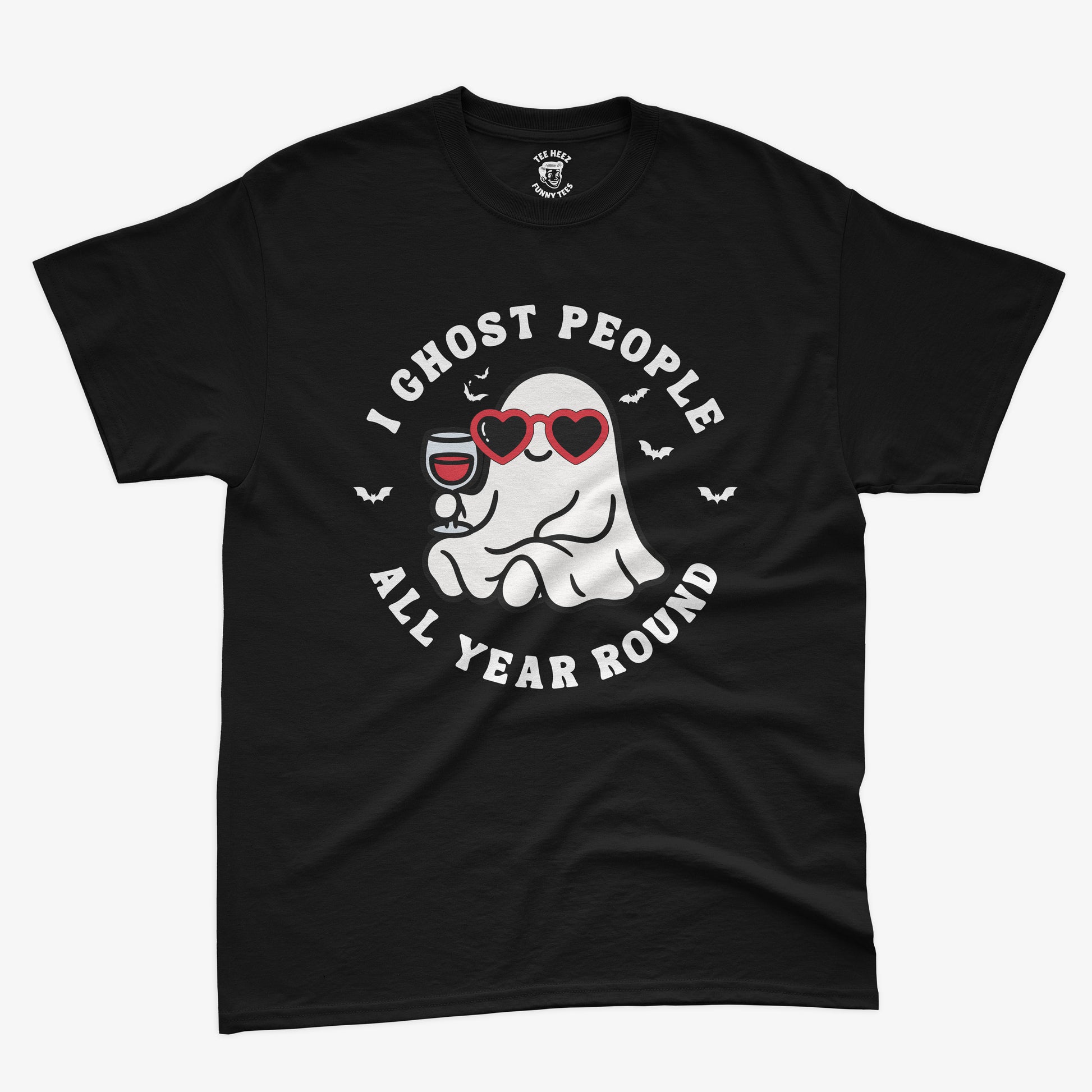 This spooky-cute t-shirt features a chill ghost with heart-shaped sunglasses and a glass of wine, serving sass and silence in equal measure. Whether you're dodging texts, skipping parties, or just vibing solo, this shirt is your new favorite excuse.
