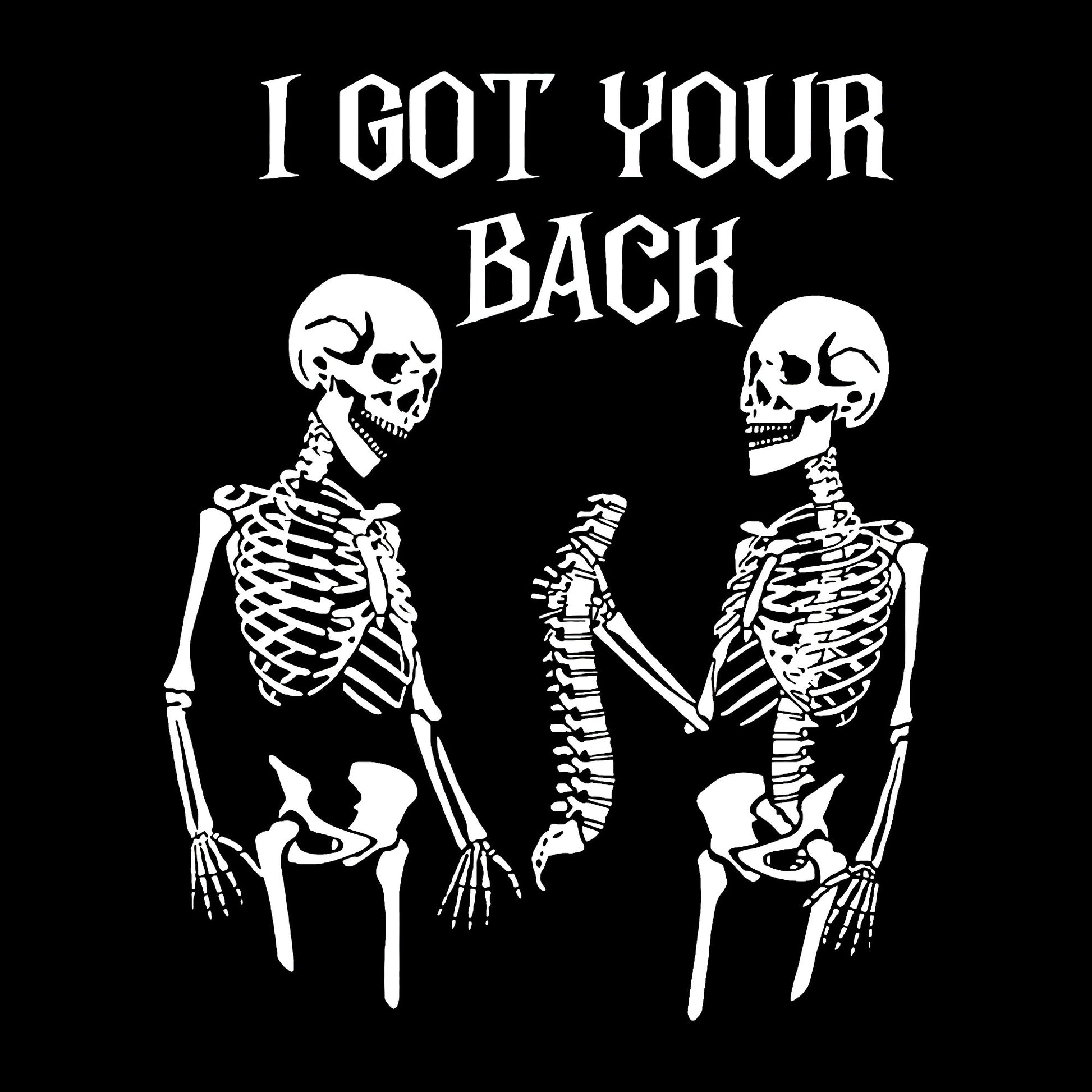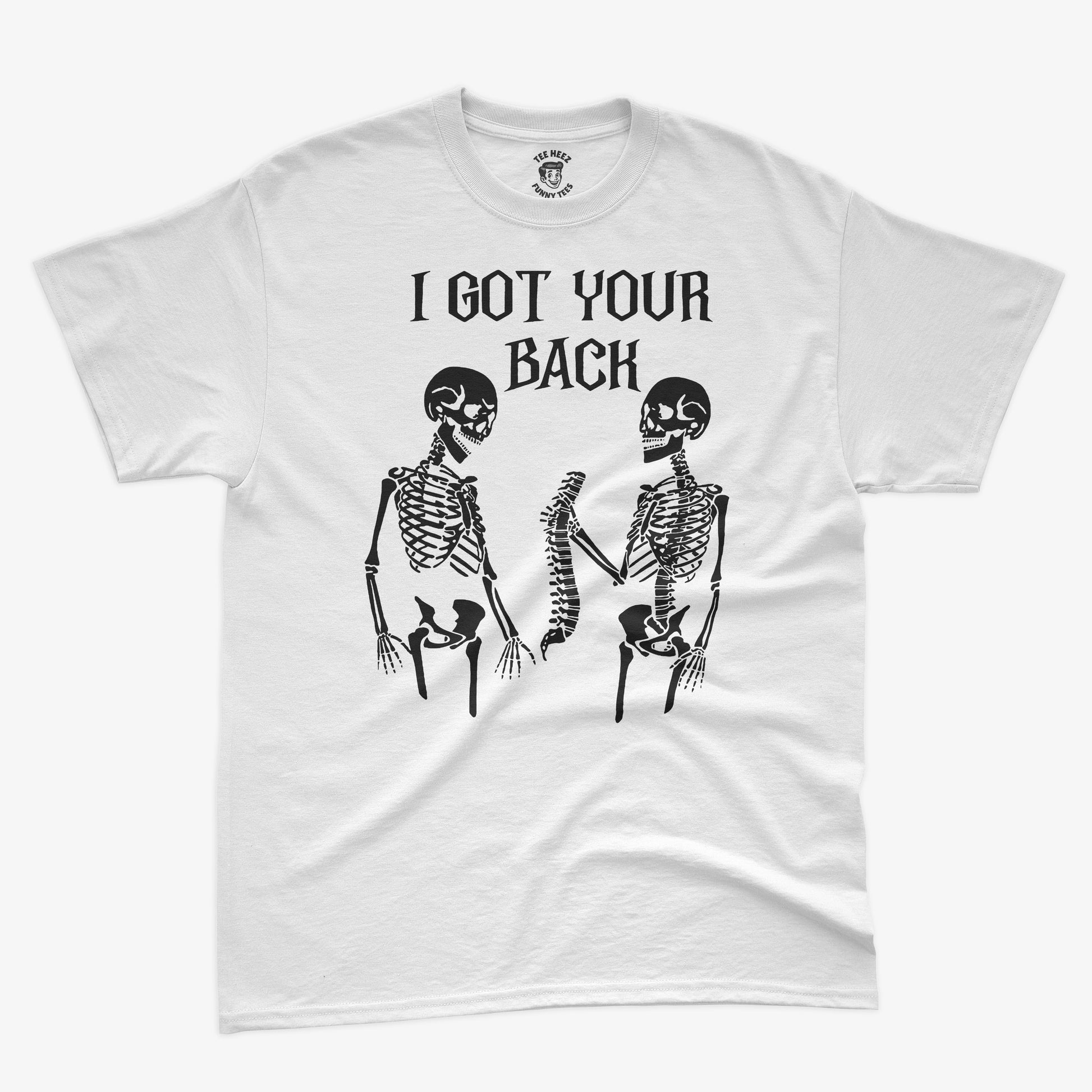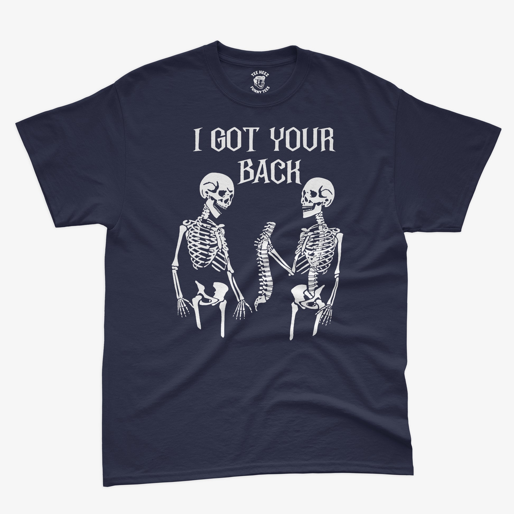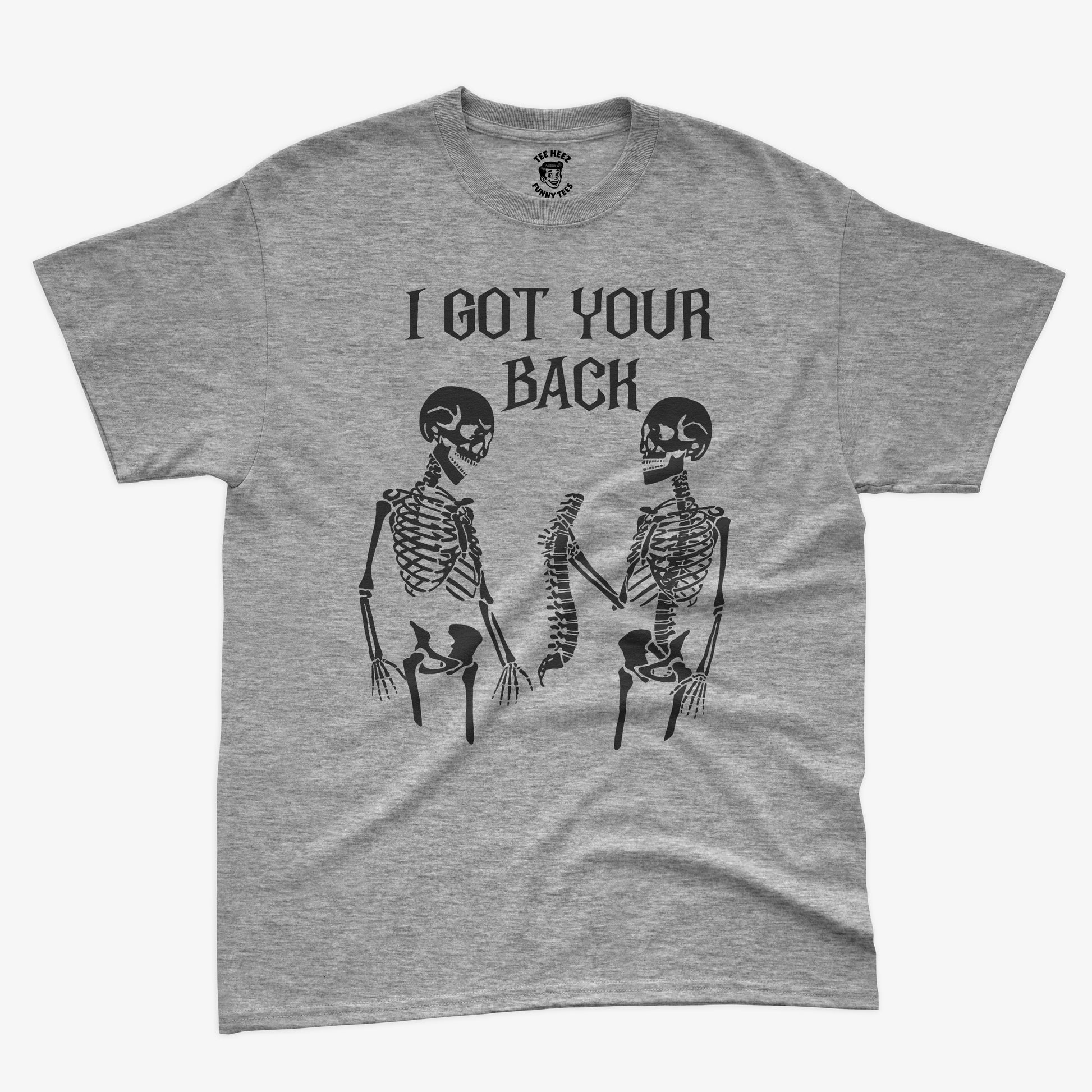 Whether it’s Halloween or just your everyday deadpan humor, this pun-packed tee features two skeletons—one proudly holding the other’s spine like it’s no big deal. It’s the perfect blend of creepy and comedy for pun lovers, pranksters, or your most loyal ride-or-die.