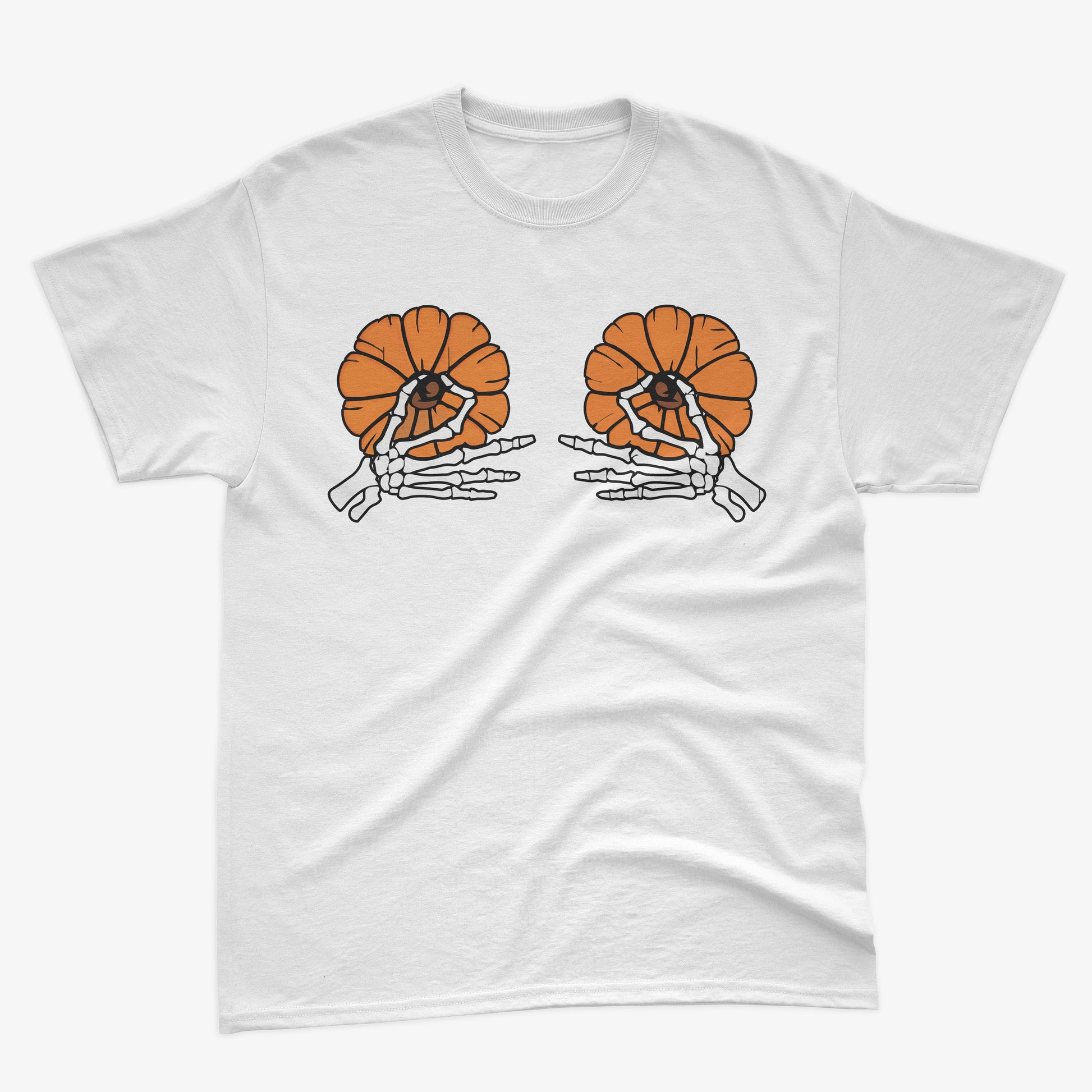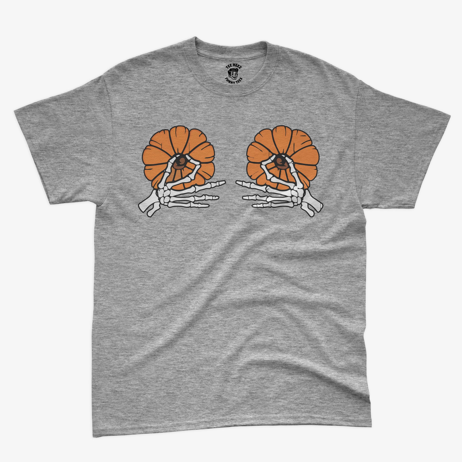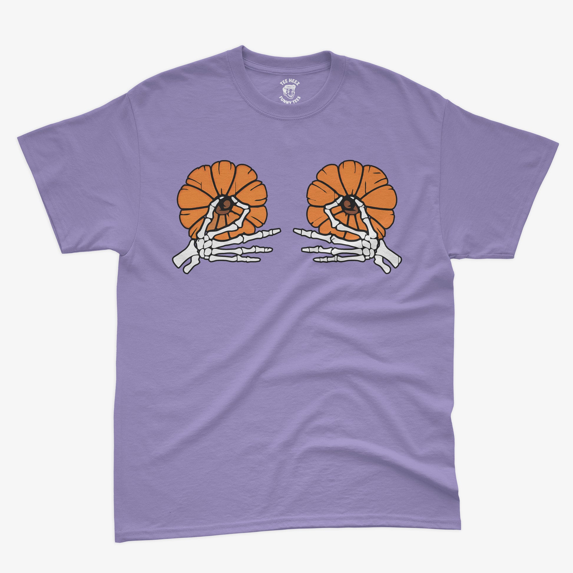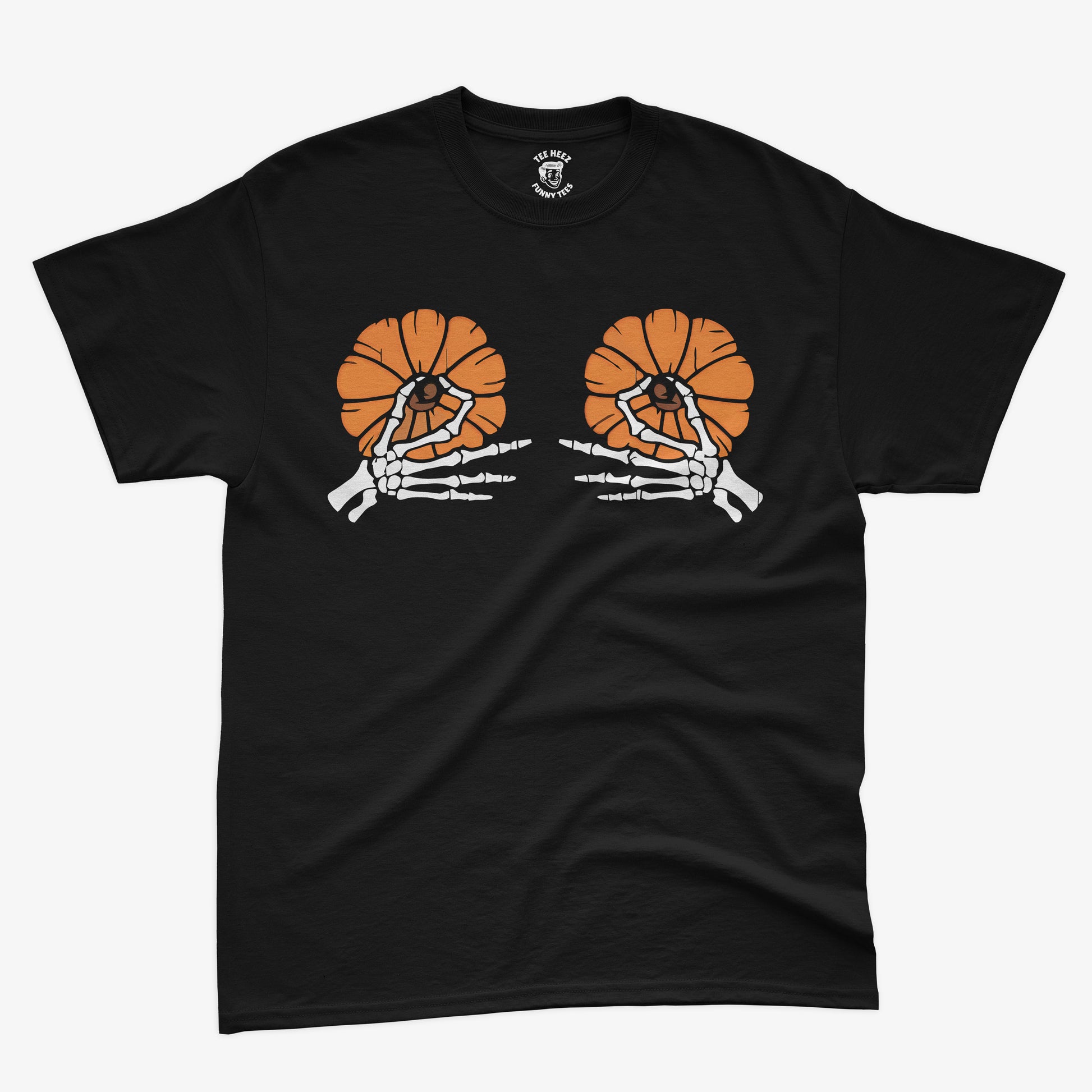 Get in the spirit of spooky season with this hilarious and slightly naughty tee! Featuring skeleton hands giving your pumpkins a little squeeze, this shirt is the perfect mix of creepy and cheeky. Whether you're headed to a Halloween party, pumpkin patch, or just want to make people laugh at the grocery store — this shirt is a certified fall favorite.